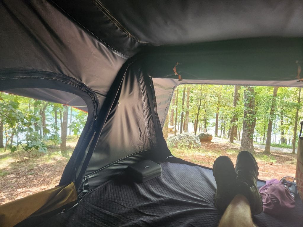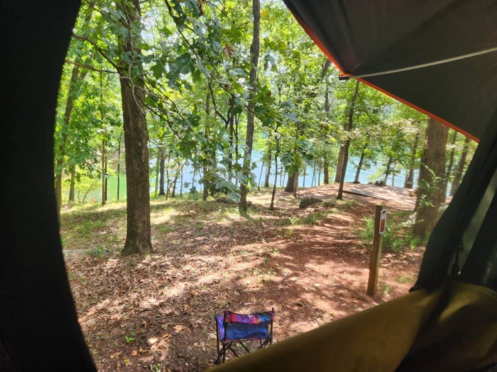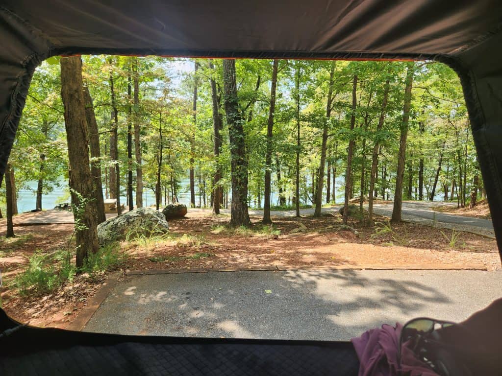 I got to my campsite, and it was a beautiful overlook view from the tent once I got my campsite setup. The spots in the area I was in seem to be dual purpose. You could essentially park 2 cars on the deck, but I probably wouldn’t attempt it. There is electric and water connections, but I’m no expert on those since I power my tent with a 2nd battery. If you come with an RV, you may need adapters to connect. The fire pit is located just to the right or left of the deck, right next to the road, depending on which site you get.