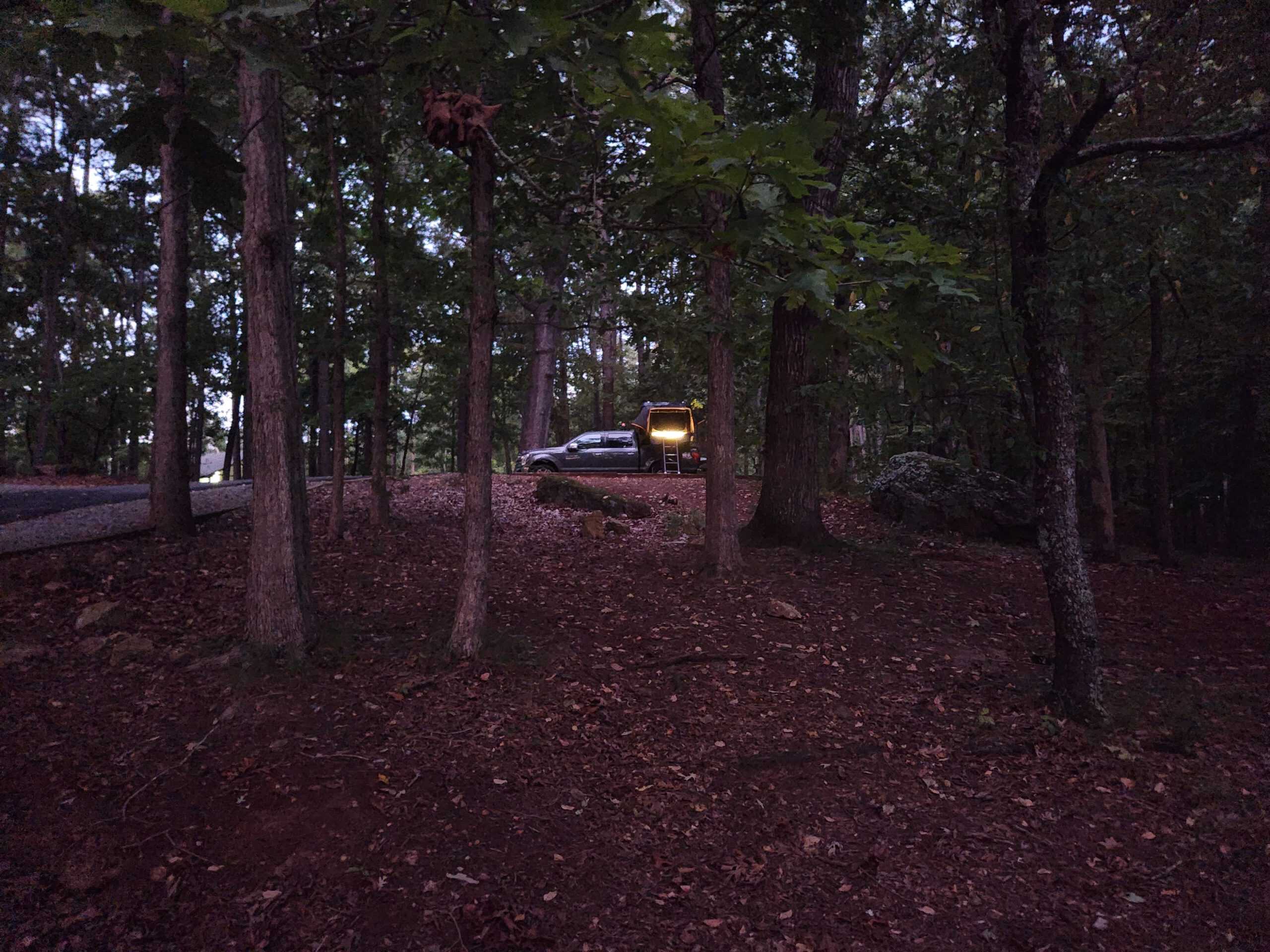 I found my camp spot, number 45, and I quickly realized this was a primitive camping site with campsite 46’s parking spot right next to mine. Luckily there was enough room for me to park my truck further to the side so that way I could pull out my tent. The lady at the front office did tell me there was someone else registered that evening in the spot next to mine but I never saw them. I did, however, have some neighbors the next campsite over, but that was about a block or two away and they seemed like a nice older couple. I loved their VW Bus! It had one of those roofs that pops up and I did manage to get a picture, but I gotta find it.