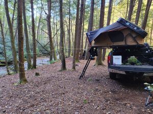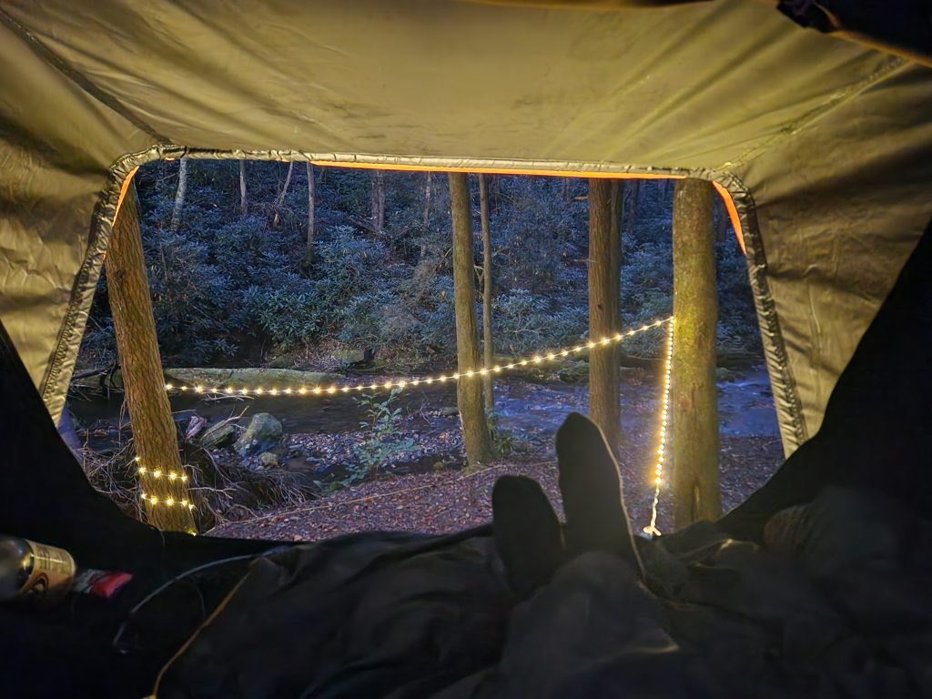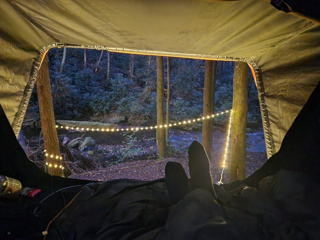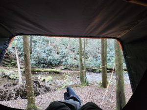 I crashed out around 7/8 pm. The flowing creek, the sound of faint music and kids playing cornhole was quite relaxing, I mean, let’s be honest, dangerous wildlife would likely leave me alone in this scenario. 🤣