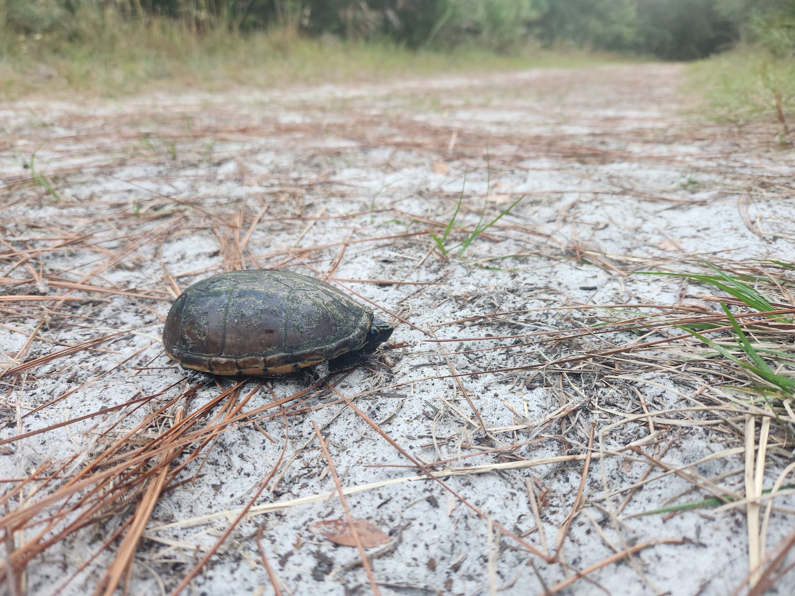 Came across this cute little turtle, I’m horrible at recognizing which they are, it’s gotta be either a box turtle or a gopher tortoise.  Don’t even try to ask me about birds, I have no clue.  Spending time trying to look up animals and their names while on-trail is not something I strive for. 🤣 I did however move him forward a few feet to get him out of the middle of the trail.  This trail is used by a ton of people that race on bikes.  Didn’t want the little guy to get run over.